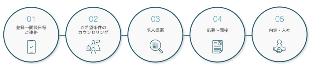 ウィルオブテックを利用した転職活動は、以下の5ステップで進みます。面談時に独自の適性テストを実施する点が、他社エージェントにはない大きな特徴です。
