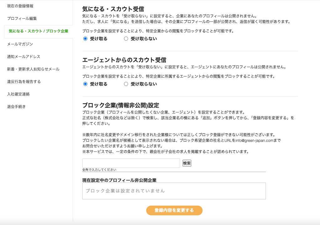 企業名でブロック登録を行えば、その企業の採用担当者の検索結果にあなたのプロフィールは表示されません。現在の勤務先だけでなく、関連会社や取引先なども併せて登録しておくとより安心です。