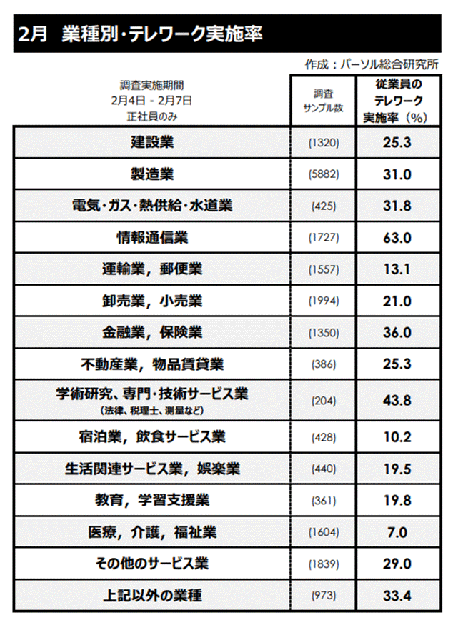 2026年2月時点での業種別テレワーク実施率を見ると、情報通信業(IT)は全業種の中で最も高い水準です。